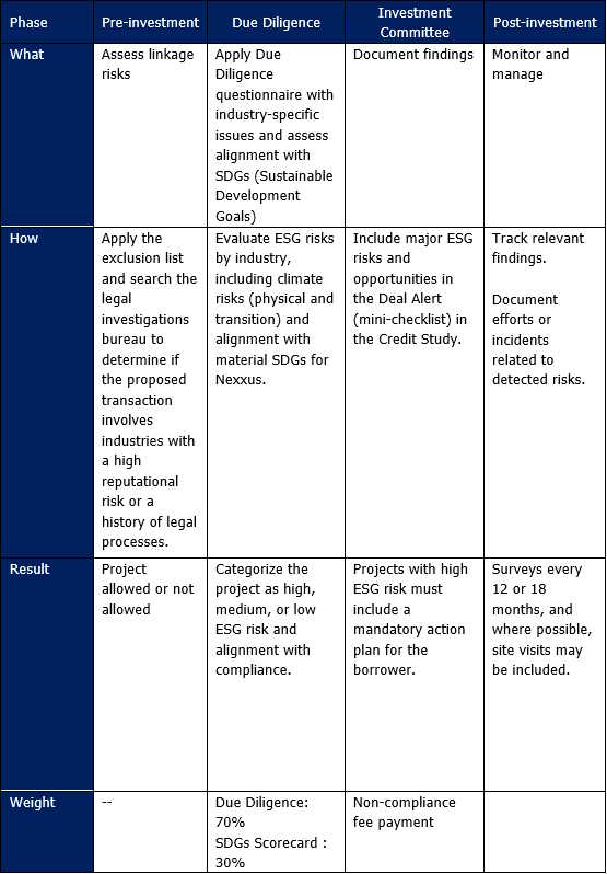 In light of the above, Nexxus’ responsible investment policy establishes general guidelines for capital investments, and this document outlines the specific methodology for private debt financing in Mexico.